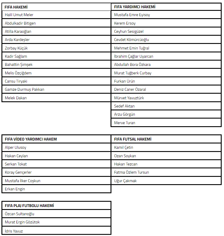01.01.2024 tarihinden itibaren geçerli olacak olan ve FIFA tarafından onaylanan listede, FIFA hakemi olarak Zorbay Küçük, Kadir Sağlam, Bahattin Şimşek ve Melek Dakan; FIFA Yardımcı Hakemi olarak Furkan Ürün, Deniz Caner Özaral ve Merve Turan; FIFA Video Yardımcı Hakem olarak Serkan Tokat ve Mustafa İlker Coşkun; FIFA Plaj Hakemi olarak İdris Yavuz listeye eklendi..