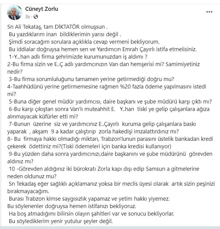 CHP Ortahisar Belediye Meclis Üyesi Cüneyt zorlu, gece yarısı sosyal medya hesabından yaptığı paylaşımda TİSKİ Genel Müdürü Ali Tekataş için ciddi iddialar ortaya attı. İşte Cüneyt Zorlu’nun çok konuşulacak paylaşımı;