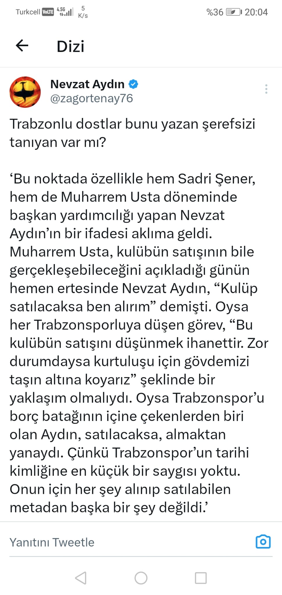Şimdi gelelim yazdığımız yazıyı inkar eden ve, “Kim bu şerefsiz tanıyan var mı dostlar?” diye soran ve, “Çöp, Trabzon’da bir gazeteci” diye paylaşımını bağlayan Nevzat Aydın’ın gerçek yüzünü ve yalanını yüzüne çarpmaya… Muharrem Usta’nın kulübü satışa çıkarmanın bile mümkün olabileceğini söylediği günlerde yönetimden daha yeni ayrılmış Nevzat Aydın, sosyal medya hesabından bu konuyla ilgili kendisine soru soranlara bakın ne diyor? “Böyle bir şey olmaz, Katarlılara satış olmaz, olamaz… Böyle bir şey olacaksa biz varız arkadaşlar”… Evet Nevzat Aydın; Ne diyorsun şimdi? Paniğe kapılıp tweetini silme sakın olur mu? Öyle sosyal medya şövalyeliğine soyunmak kolay… Yüreğin yetiyorsa karşıma çık da tartışalım, konuşalım olur mu? Trabzonspor gibi bu kentin onuru, gururu, en önemli tarihi değerinin satışı söz konusu olduğunda bu kulübe gönül vermiş olanların yapacağı tek şey gövdesini taşın altına sokup, kurtuluşunu sağlamak, onu batıran sürecin taşlarını ören kim varsa lanetlemek ve bir daha da çevresine bile yaklaştırmamaktır. Ama siz ne diyorsunuz isterseniz bir daha okuyun söylediklerinizi…