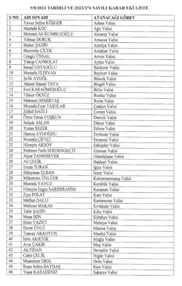 Kararnameyle Adana ve İzmir valileri yer değiştirdi. Süleyman Elban İzmir'e, Yavuz Selim Köşger ise Adana'ya atandı. AFAD Başkanı Yunus Sezer Edirne, TBMM Genel Sekreteri Ali Kumbuzoğlu Aksaray Valisi oldu.