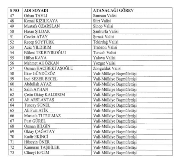Karara göre 57 kente yeni vali görevlendirmesi yapıldı, 16 vali mülkiye başmüfettişi olarak atandı. Toplam 73 valinin görev yeri değişti.