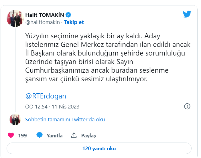 - Yüzyılın seçimine yaklaşık bir ay kaldı. Aday listelerimiz Genel Merkez tarafından ilan edildi ancak İl Başkanı olarak bulunduğum şehirde sorumluluğu üzerinde taşıyan birisi olarak Sayın Cumhurbaşkanımıza ancak buradan seslenme şansım var çünkü sesimiz ulaştırılmıyor.