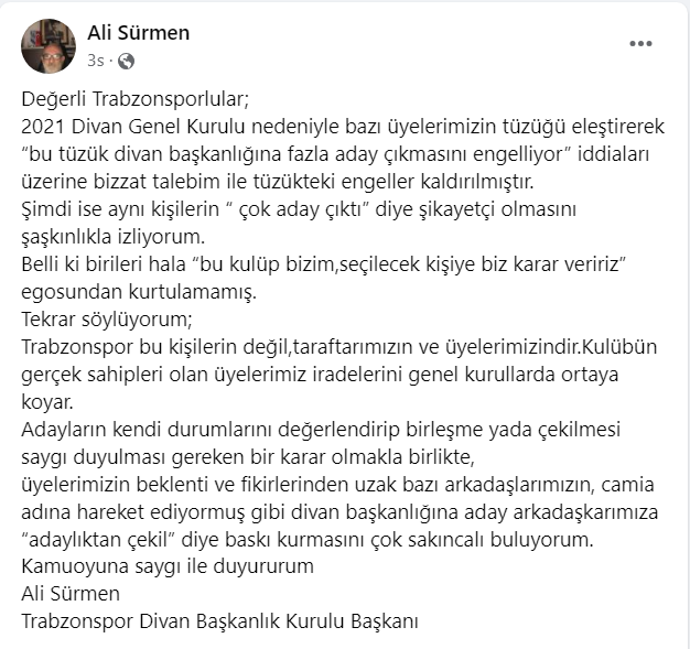 Trabzonspor Divan Başkanlık Kurulu Başkanı Ali Sürmen sosyal medya hesabında yaptığı paylaşımda, “bu kulüp bizim,seçilecek kişiye biz karar veririz” egosundan kurtulamamış dedi.