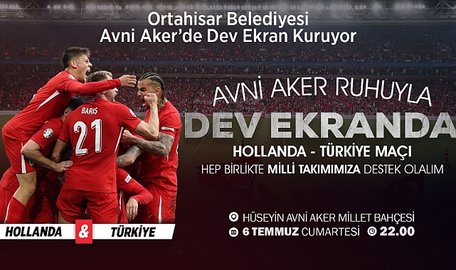 Ortahisar Belediyesi, EURO 2024 Avrupa Futbol Şampiyonası’nda Milli Takımımızın çeyrek final mücadelesini dev ekrana yansıtacak. Türkiye-Hollanda maçı için Avni Aker Millet Bahçesi’ne kurulan dev ekranla Trabzonspor’un büyük başarılara imza attığı Hüseyin Avni Aker’de bir kez daha maç heyecanı yaşanacak. 6 Temmuz 2024 Cumartesi günü saat 22.00’de oynanacak çeyrek final maçında vatandaşlar hep birlikte milli takıma destek verecek.