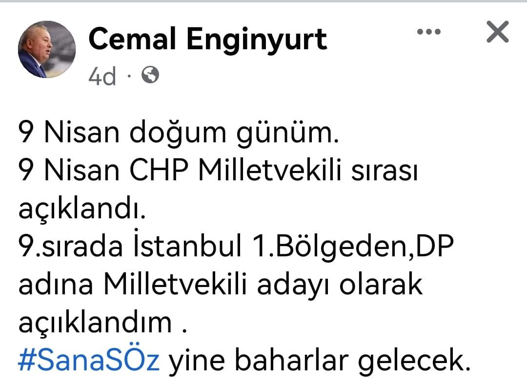 Demokrat Parti Genel Başkan Yardımcısı ve Ordu Milletvekili Cemal Enginyurt, yeni dönemde İstanbul Milletvekili adayı olduğunu duyurdu. Sosyal medya hesabında kendisi adına 9 Nisan tarihinin önemine vurgu yapan Enginyurt, şu paylaşımda bulundu;