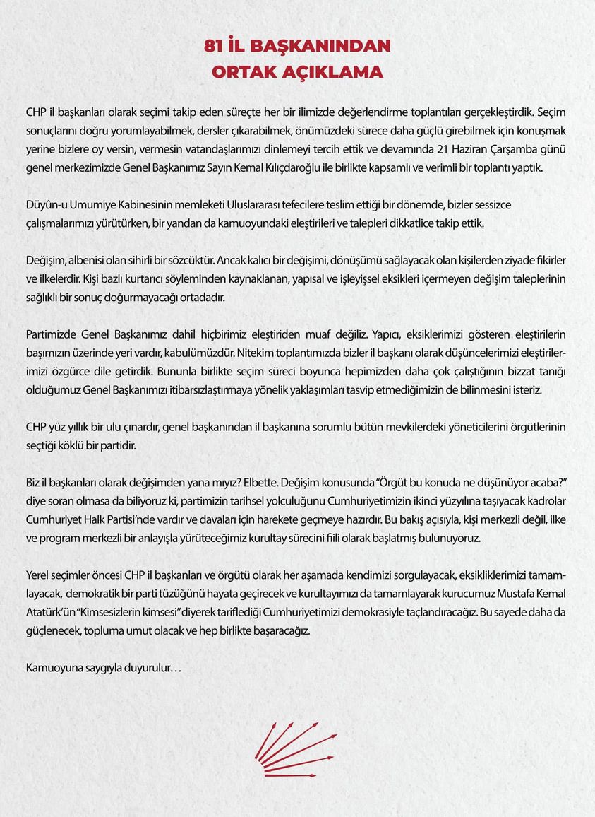 CHP lideri Kılıçdaroğlu'nun il başkanlarıyla toplantısı 8 buçuk saat sürdü. Toplantının ardından İstanbul İl Başkanı Kaftancıoğlu "Ortak bildiriyi" sosyal medya hesabında paylaştı ;