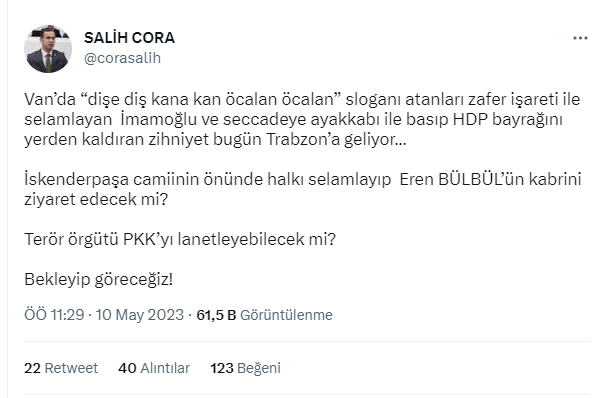AK Partili Cora, Twitter hesabından yaptığı paylaşımda "Van’da “dişe diş kana kan öcalan öcalan” sloganı atanları zafer işareti ile selamlayan İmamoğlu ve seccadeye ayakkabı ile basıp HDP bayrağını yerden kaldıran zihniyet bugün Trabzon’a geliyor… İskenderpaşa camiinin önünde halkı selamlayıp Eren Bülbül'ün kabrini ziyaret edecek mi? Terör örgütü PKK’yı lanetleyebilecek mi? Bekleyip göreceğiz!" ifadelerini kullandı.