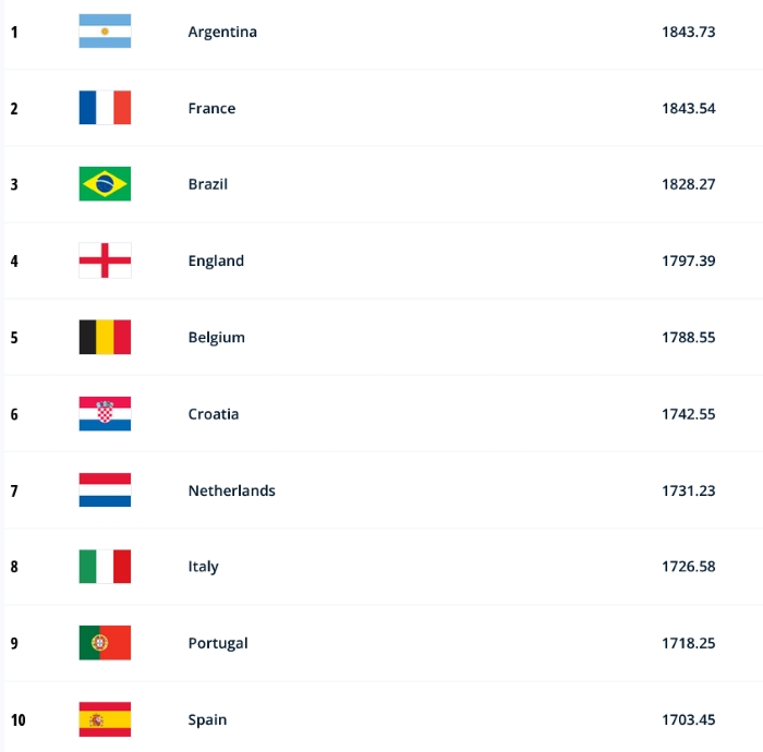 FIFA'nın internet sitesinde yayınlanan haziran ayı sıralamasında ilk üç sıra değişmedi. 2022 Dünya Kupası şampiyonu Arjantin 1.843,73 puanla birinciliğini korurken, Fransa 1843,54 puanla 2'nci, Brezilya ise 1828 puanla 3'üncü sırada yer aldı. Bu takımları 1797 puanla 4. sıradaki İngiltere ve 1788 puanla 5. sıradaki Belçika takip etti.