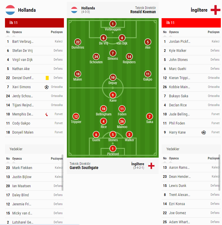 HOLLANDA: Verbruggen, Dumfries, Van Dijk, De Vrij, Aké, Reijnders, Schouten, Simons, Malen, Gakpo, Depay.