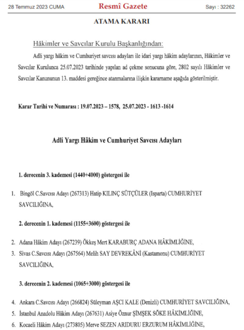 25 Temmuz 2023'te yapılan ad çekme sonucuna göre hakim ve savcı adaylarının yeni görev yerlerinin açıklandığı liste de Resmi Gazete'de yayımlandı.