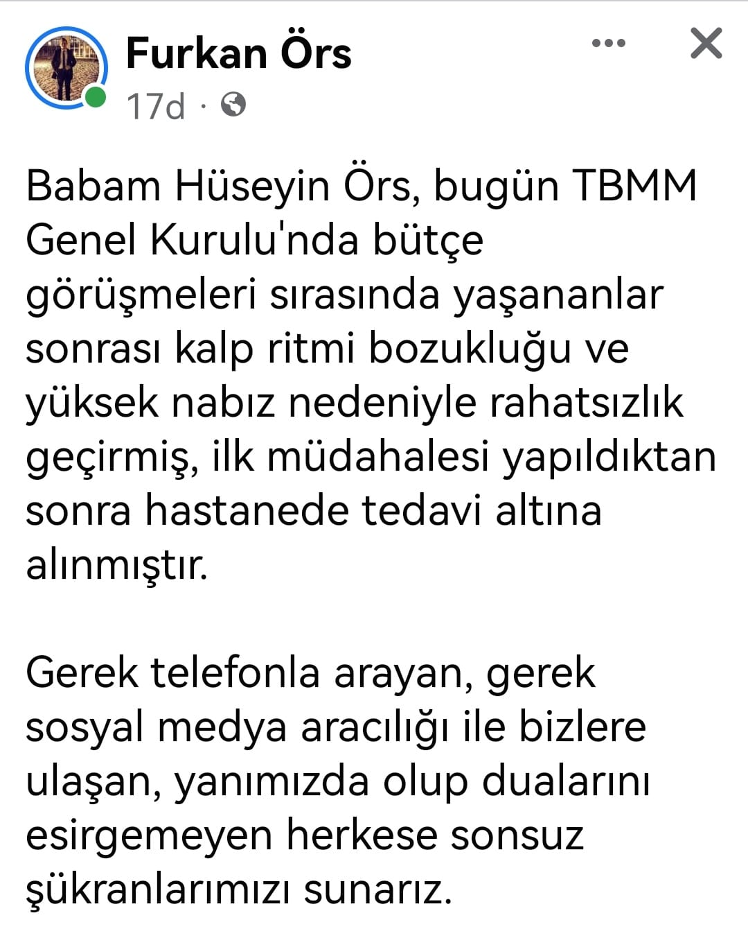 Öte yandan Hüseyin Örs'ün oğlu Furkan Örs'de kendi sosyal medya hesabında yaptığı paylaşımda;