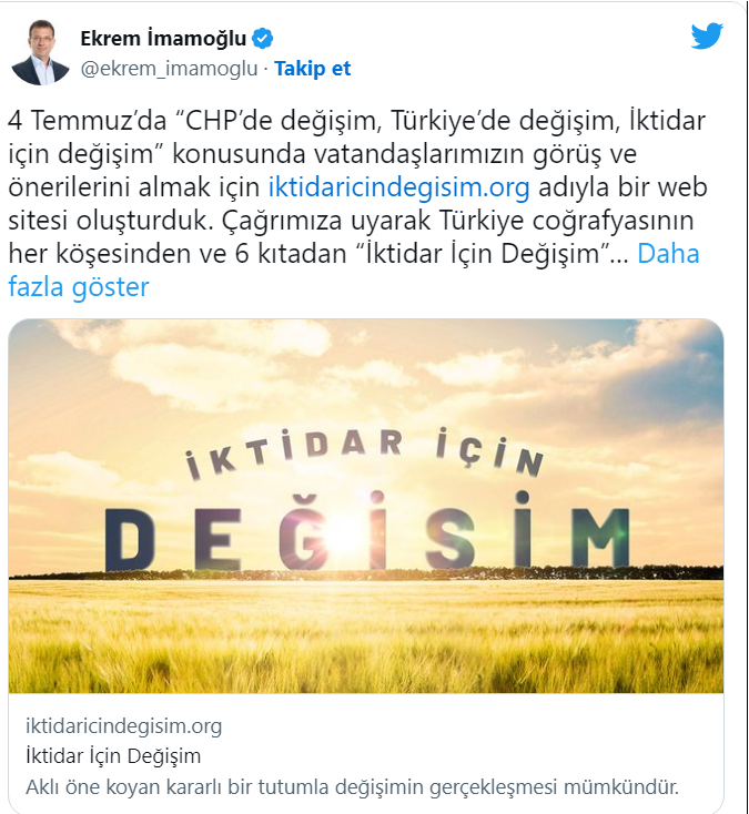 İmamoğlu, "Toplum, CHP’de lider ve yönetiminin değişmesini, bu değişimin hem kuşak hem vizyon ekseninde olmasını istiyor. Toplumun ihtiyaçlarına uygun net bir vizyon ve politikalar belirlenmesini, kapsayıcı bir demokrasi ve laiklik anlayışının üretilmesini bekliyor" ifadelerini kullandı.