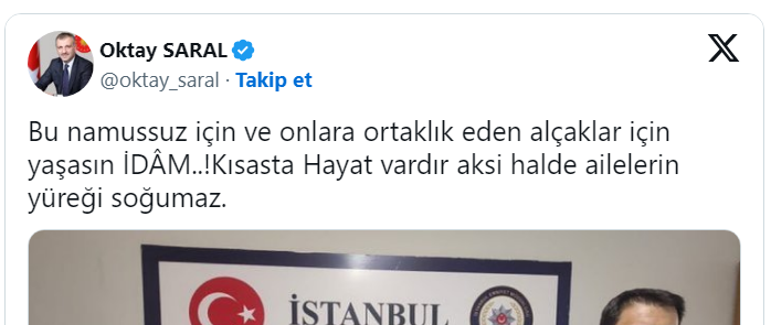 Cumhurbaşkanı Başdanışmanı Oktay Saral, sosyal medya hesabından yaptığı paylaşımda saldırının ardından yakalanan şüpnelilerden birinin fotoğrafını paylaşarak idam edilmesini istedi: Saral, "Bu namussuz için ve onlara ortaklık eden alçaklar için yaşasın idam. Kısasta hayat vardır aksi halde ailelerin yüreği soğumaz" ifadesini kullandı.