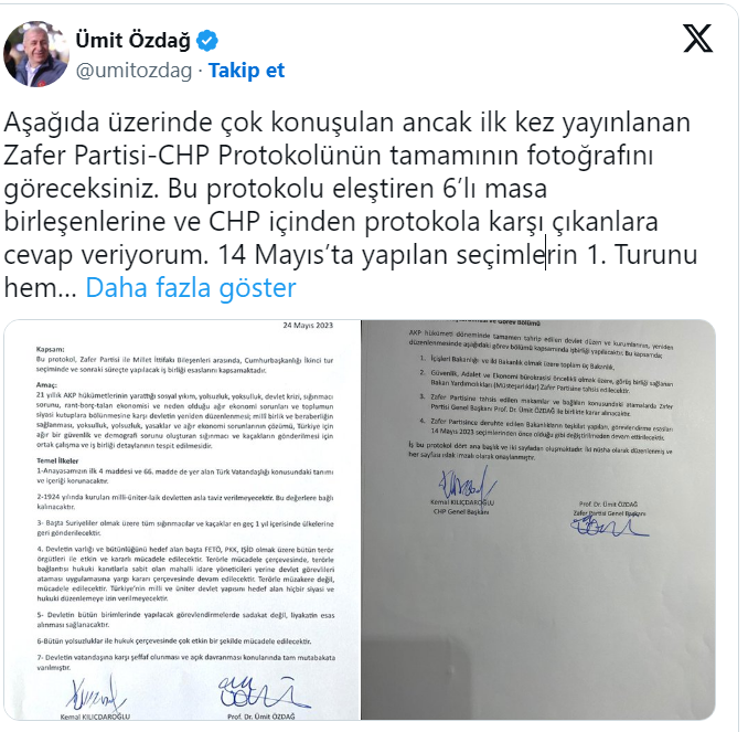 Zafer Partisi Genel Başkanı Ümit Özdağ, 2023 Genel Seçimi'nde Cumhurbaşkanı adayı olan ve ilk turda kazanamayan eski CHP Genel Başkanı Kemal Kılıçdaroğlu ile ikinci tur öncesi yaptığı 'gizli protokol'ün belgelerini paylaştı.
