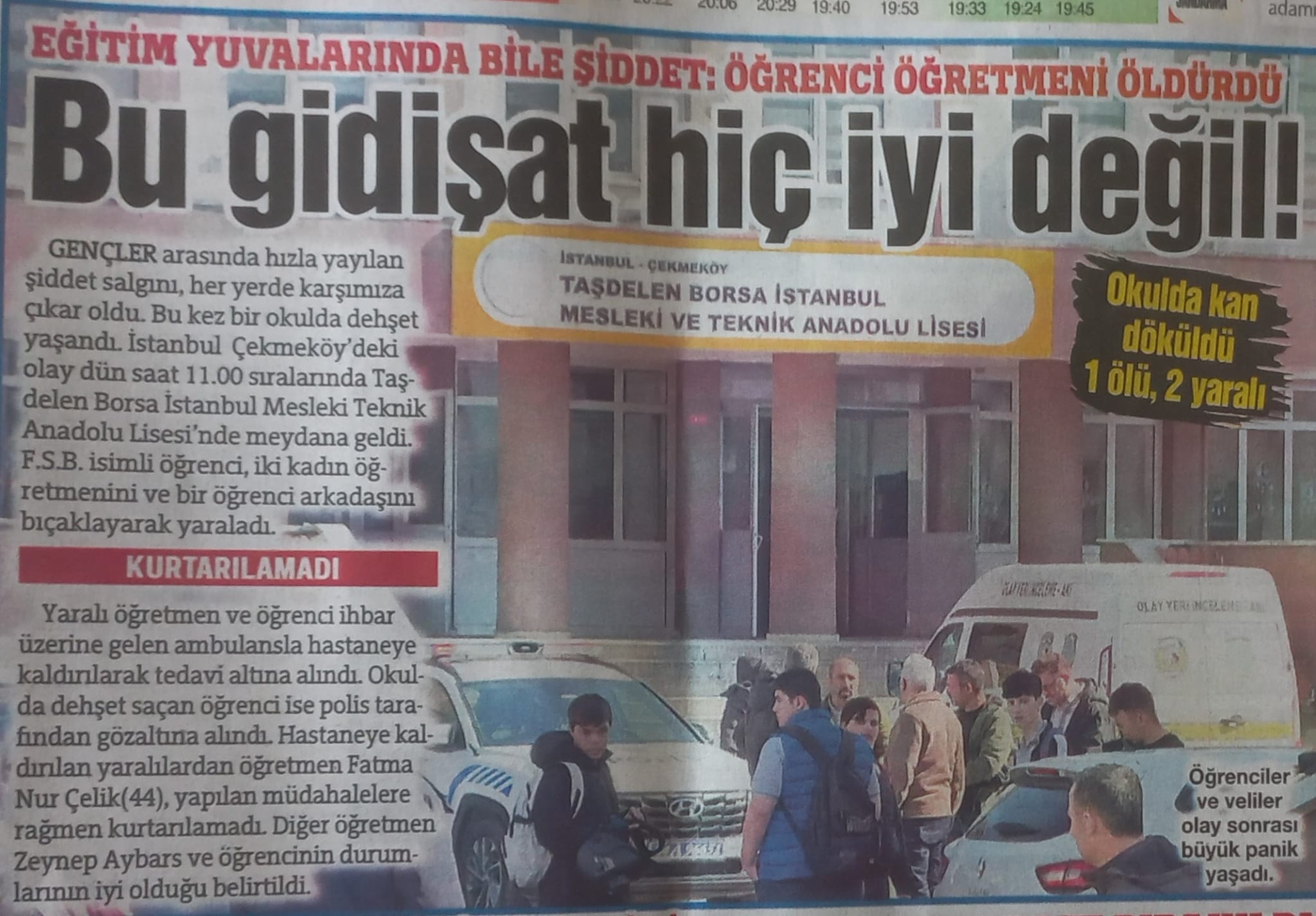 Okullarda meydana gelen son şiddet vakalarının en vahimi önceki gün İstanbul'da yaşandı. İstanbul Taşdelen Borsa İstanbul Mesleki Teknik Anadolu Lisesi’nde yaşanan olayda 17 yaşındaki F.S.B iki kadın öğretmeni ve bir öğrenci arkadaşını bıçaklayarak yaraladı. Büyük panik yaşanan olayda 44 yaşındaki Fatma Nur Çelik hayatını kaybetti.