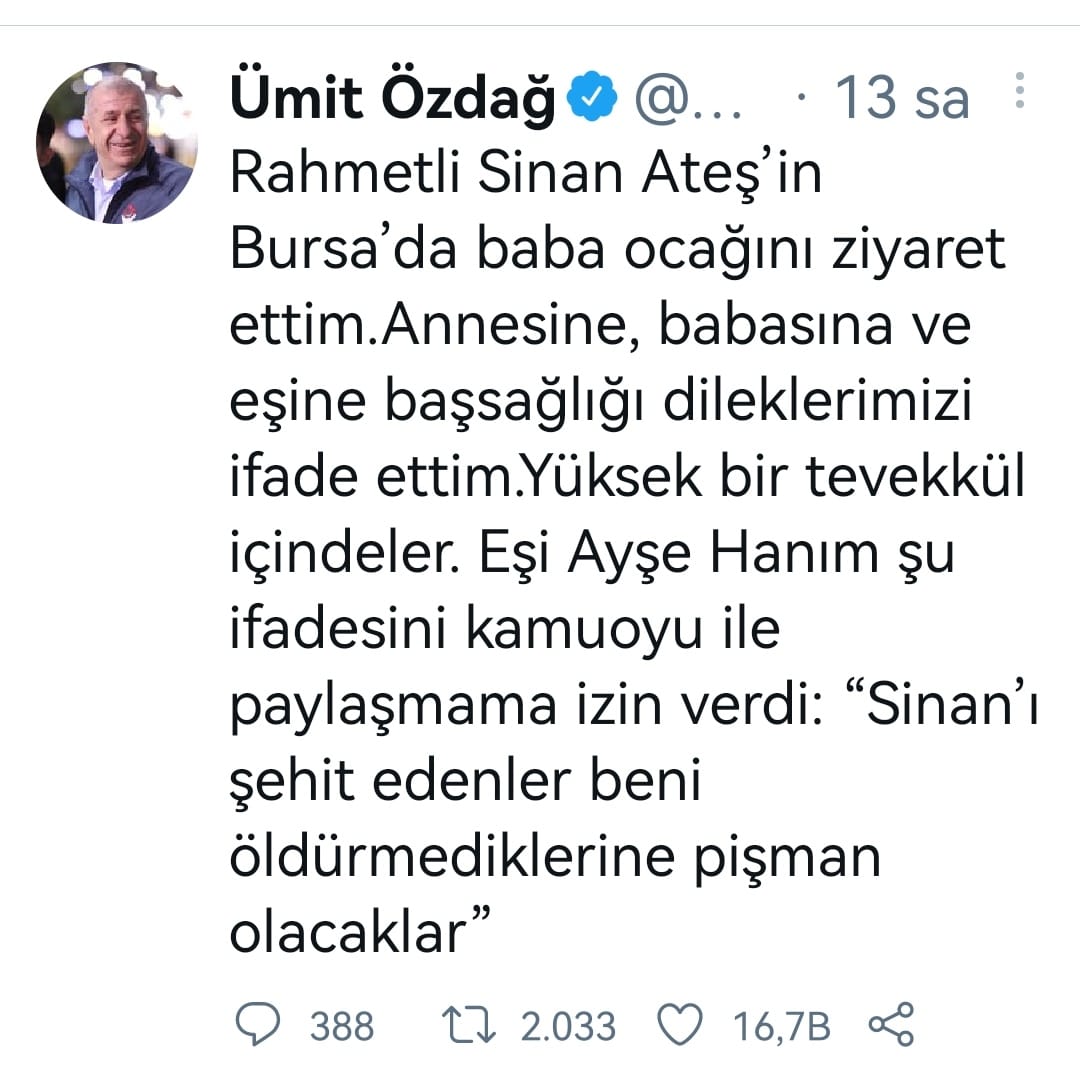Özdağ, sosyal medya hesabından Sinan Ateş'in eşi Ayşe Ateş'in, "Sinan'ı şehit edenler, beni öldürmediklerine pişman olacaklar" dediğini aktardı.