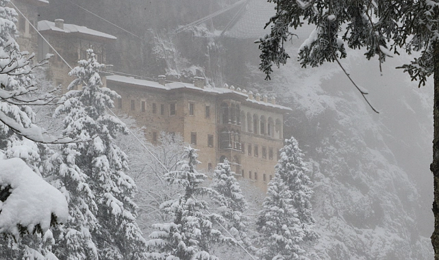 Karadağ'ın Altındere Vadisi'ne bakan eteğinde, vadiden yaklaşık 300 metre yükseklikteki ormanlık alanda kayalar oyularak yapılmış, halk arasında "Meryem Ana" adıyla bilinen Sümela Manastırı da etkili olan yağışın ardından beyaza büründü.