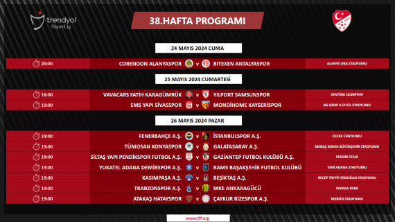 Türkiye Futbol Federasyonu (TFF), Süper Lig’in son haftası olan 38. Haftanın programını açıkladı.