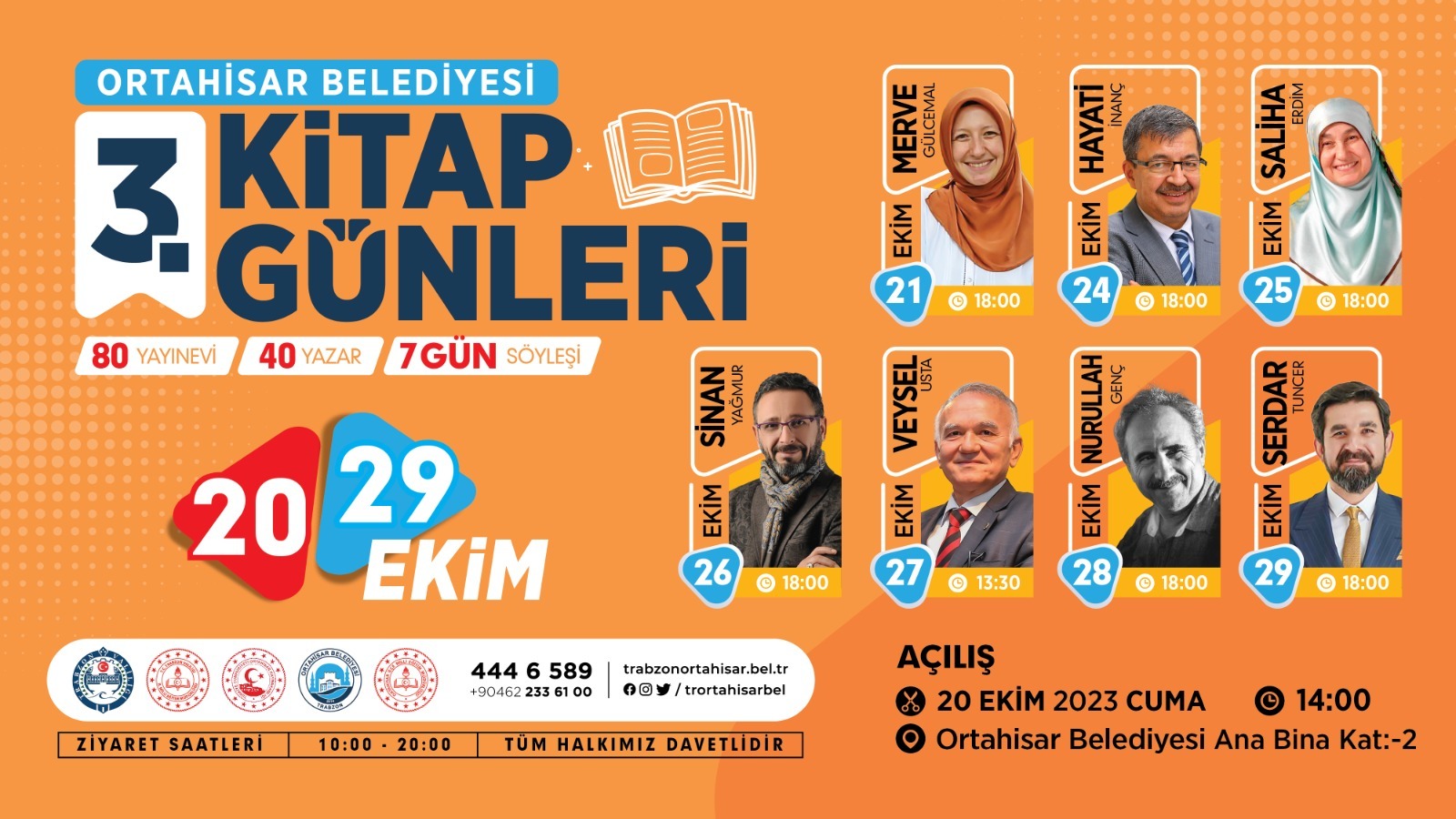 Kitapseverlerin heyecanla beklediği ‘Kitap Günleri’ cuma günü açılıyor. Ortahisar Belediyesi’nin düzenlediği ‘3. Kitap Günleri’ etkinliği 20 Ekim’de başlıyor. 20-29 Ekim tarihleri arasında Ortahisar Belediyesi ana hizmet binasında düzenlenecek etkinliğe yazarlar; Merve Gülcemal, Hayati İnanç, Saliha Erdim, Sinan Yağmur, Veysel Usta, Serdar Tuncer ve Nurullah Genç ile birlikte toplamda 40 yazar ve 80 yayınevi katılacak. Etkinliğin açılışı 20 Ekim Cuma Günü saat 14.00’te Ortahisar Belediyesi’nde gerçekleştirilecek.