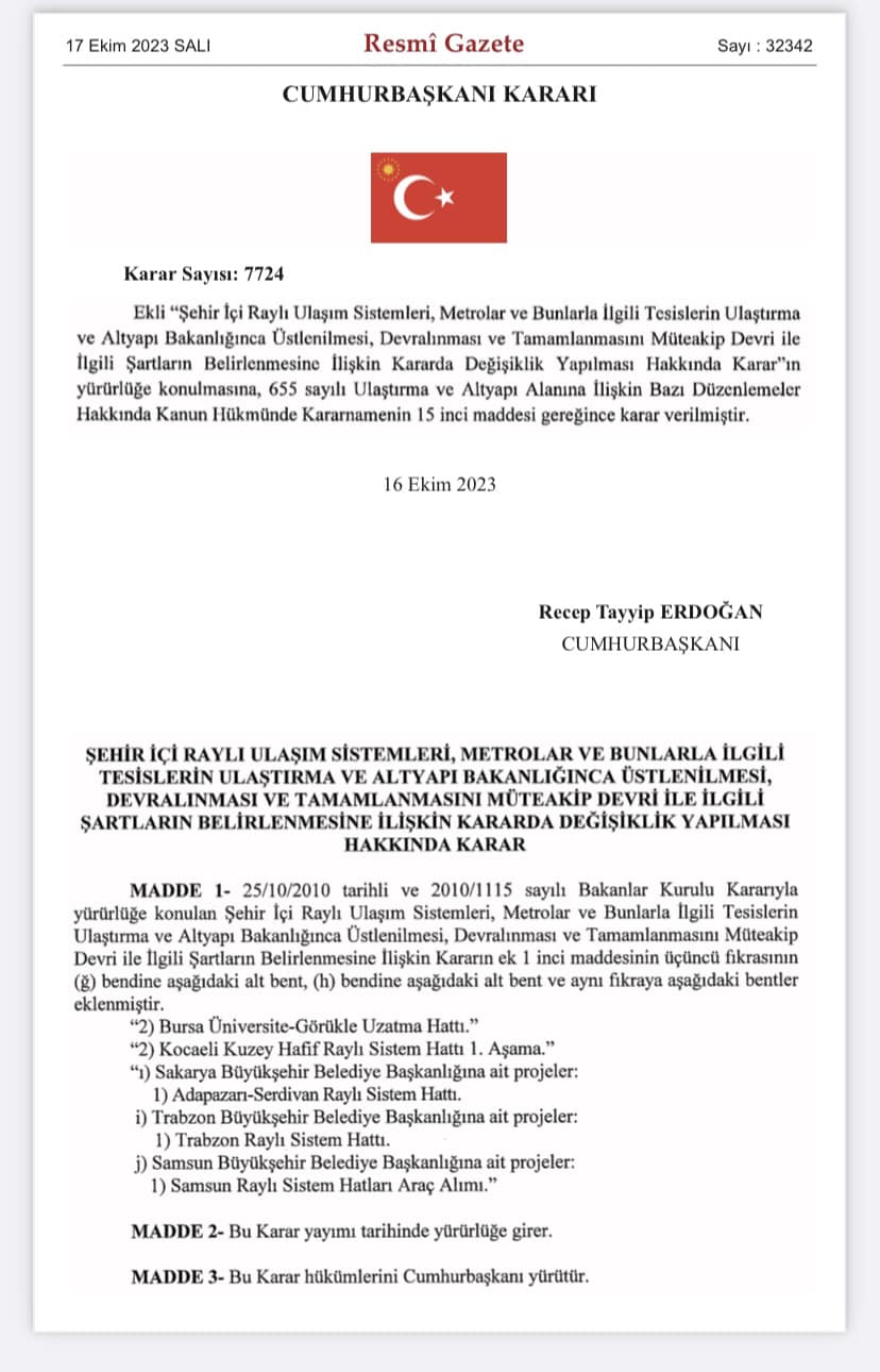 Cumhurbaşkanı Recep Tayyip Erdoğan’ın imzasıyla Trabzon Raylı Sistem Hattı, Büyükşehir Belediyesi himayesinden alınıp Ulaştırma ve Altyapı Bakanlığına devredildi.