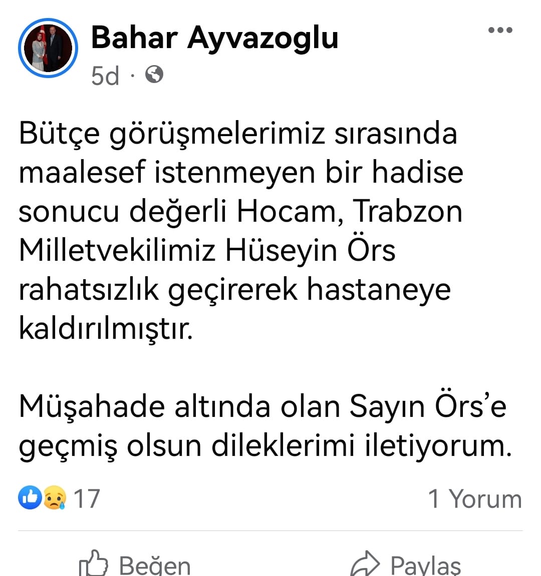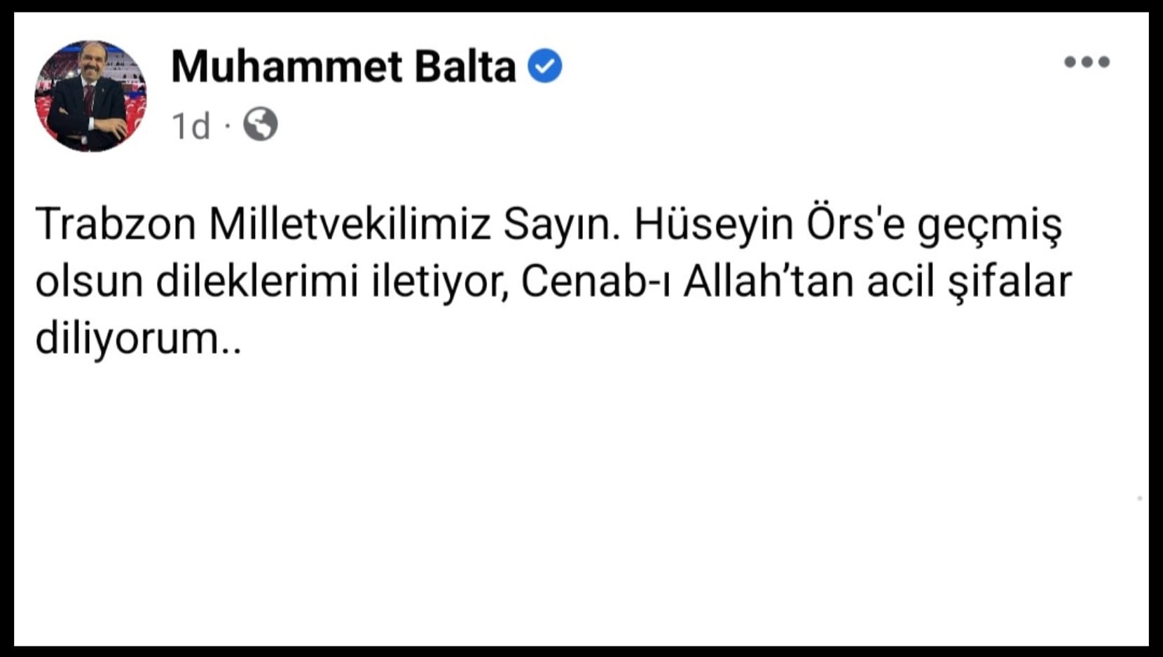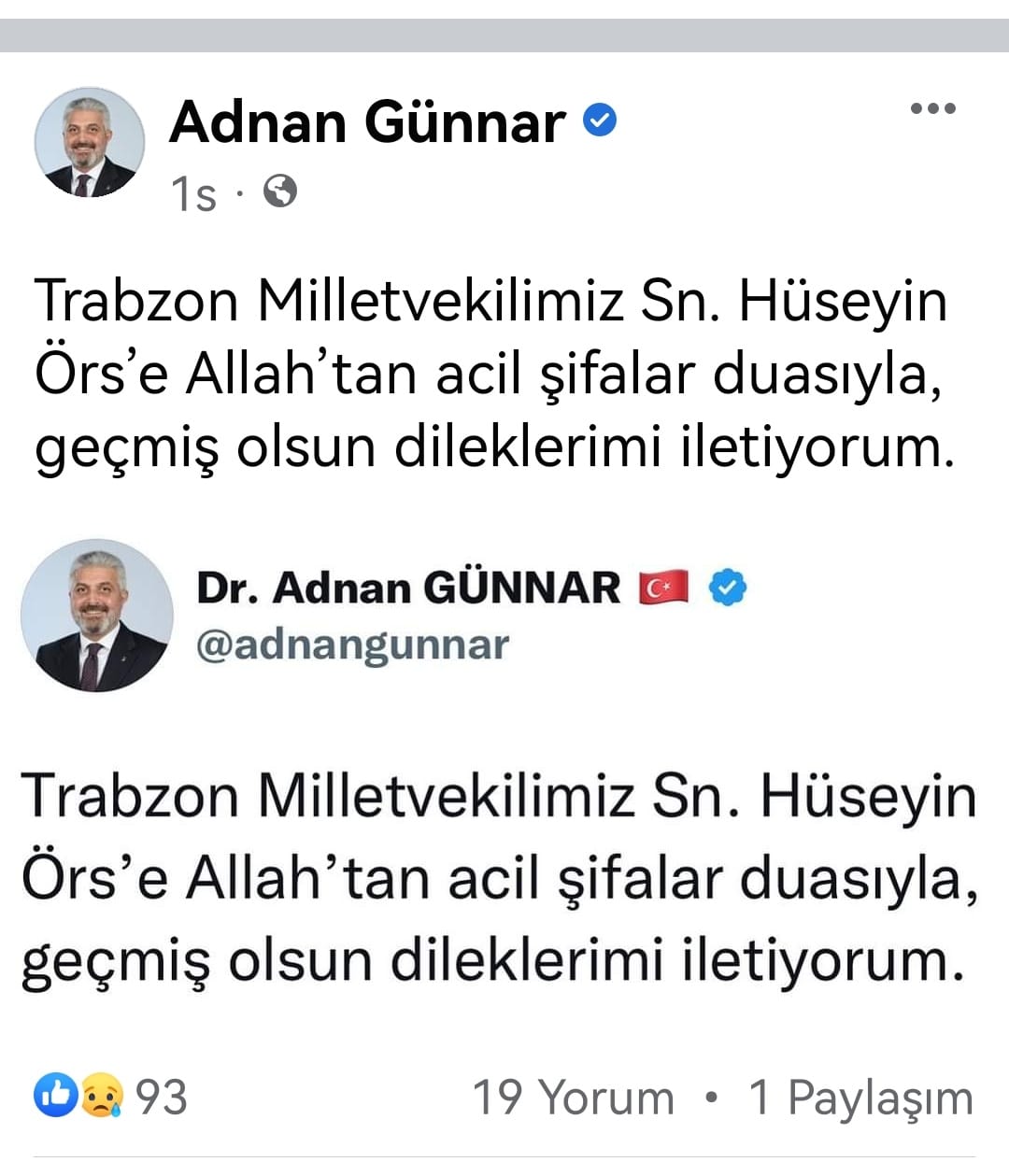 AK Parti Trabzon Milletvekilleri Salih Cora, Bahar Ayvazoğlu, Adnan Günnar ve Muhammet Balta sosyal medya hesaplarında yaptıkları paylaşımlarda Örs’e geçmiş olsun dileklerinde bulundular.