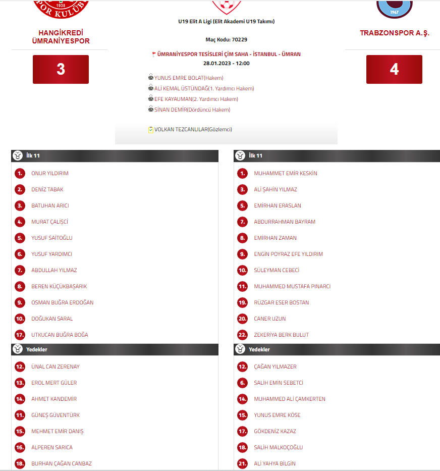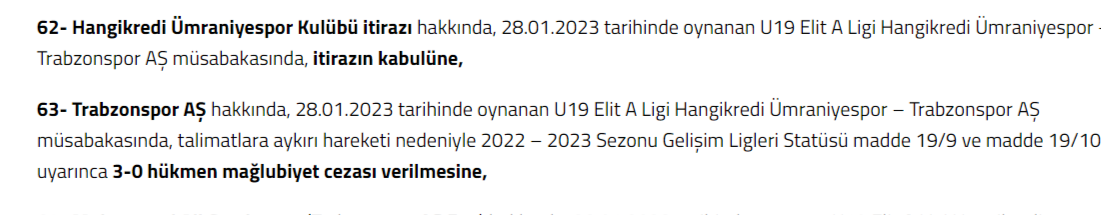 “28.01.2023 tarihinde oynanan U19 Elit A Ligi Hangikredi Ümraniyespor – Trabzonspor AŞ müsabakasında, talimatlara aykırı hareketi nedeniyle 2022 – 2023 Sezonu Gelişim Ligleri Statüsü madde 19/9 ve madde 19/10 uyarınca 3-0 hükmen mağlubiyet cezası verilmesini” uygun gördü