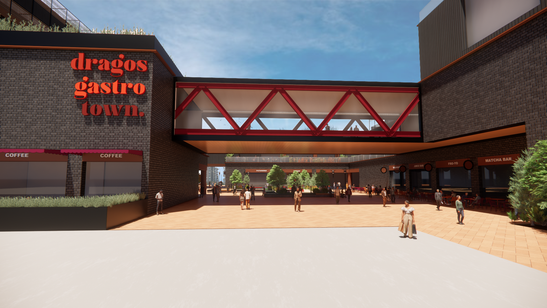 Projenin dikkat çeken yönlerinden biri, binalar arasında oluşturulan geniş açık alanlar ve ferah avlu düzeni. Bu düzen sayesinde proje sadece bir yapı değil, aynı zamanda insanların vakit geçirebileceği, nefes alabileceği bir sosyal yaşam alanı hâline geliyor. Gastro ve kafe bölümlerinin konumlandırıldığı katlarda yer alan teraslar, gün ışığını içeri alan açıklıklar ve peyzaj ile desteklenen alanlar proje atmosferine sıcaklık katıyor.