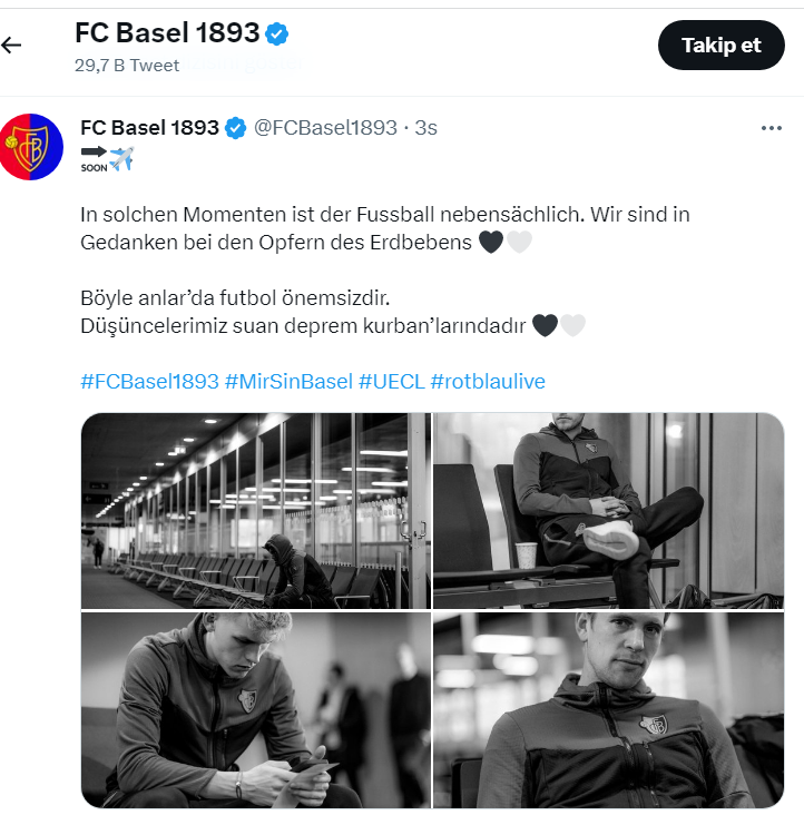 UEFA Avrupa Avrupa Konferans Ligi Play-Off Turu'nda yarın Trabzon'da, Trabzonspor ile karşılaşacak olan FC Basel 1983, Kahramanmaraş merkezli yaşanan depremlerle ilgili sosyal medya hesabından paylaşımda bulundu. Havaalanından siyah-beyaz fotoğraflar paylaşan Basel, "Böyle anlarda futbol önemsizdir. Düşüncelerimiz şu an deprem kurbanlarındadır" notunu ekledi.