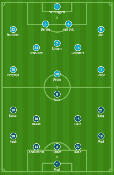 Hollanda: Verbruggen, Dumfries, De Vrij, Van Dijk, Ake, Schouten, Reijnders, Simons, Malen, Depay, Gakpo